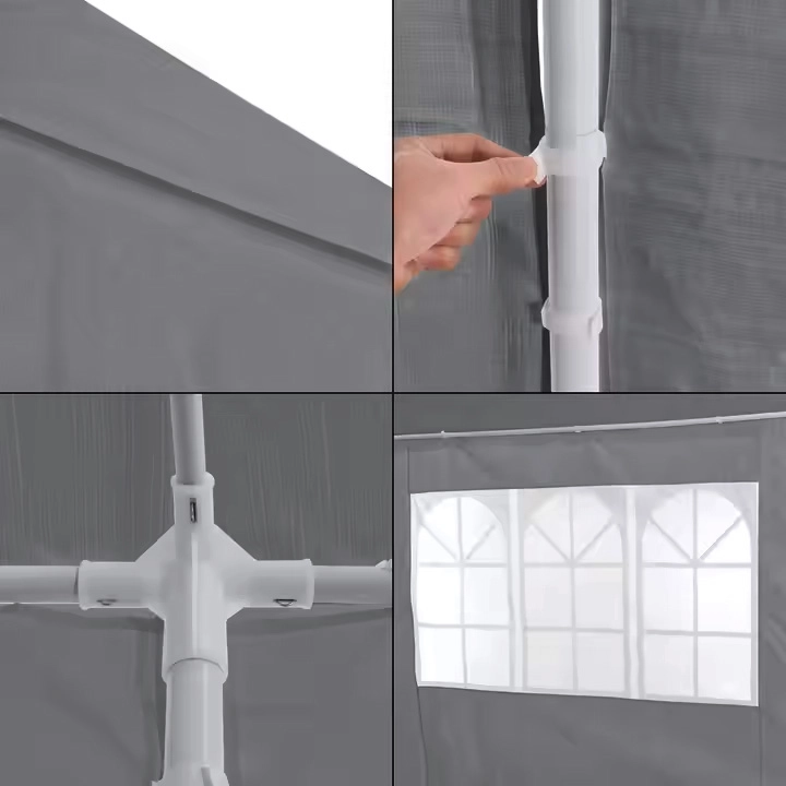 Șase panouri ușor detașabile cu bandă velcro: un perete plin, unul cu fermoar și patru cu ferestre pentru lumină, ventilație și flexibilitatea spațiului.
