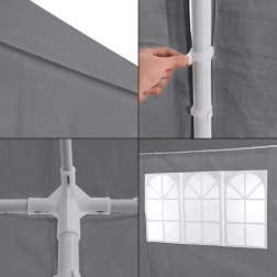 Cadrul robust din țevi de oțel vopsite în câmp electrostatic (Ø 32/25/25 mm) și opțiunea de ancorare cu țăruși oferă stabilitate în utilizarea frecventă. Prelata și pereții din polietilenă 100 g/m², în elegantul gri, sunt rezistente și ușor de întreținut. Datorită benzilor velcro, pereții se atașează sau se detașează rapid – pe timp rece puteți închide complet spațiul, iar pe căldură îl deschideți pentru ventilație mai bună.