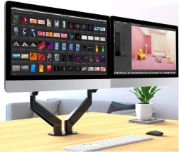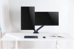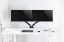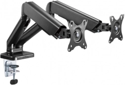 Suportul util pentru două monitoare de dimensiuni 17 până la 32 inci, cu o capacitate de până la 9 kg, oferă aranjarea flexibilă și confortabilă a spațiului de lucru. Arcul cu gaz permite reglarea lină și cu o singură atingere a poziției monitoarelor, contribuind la o ergonomie și un confort optim la muncă. Montarea pe birou folosind o clemă asigură stabilitate și siguranță.