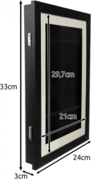 Instalarea este rapidă și fără găurire – în pachet găsești cârlige fără urme cu pioneze care nu deteriorează peretele. „Sticla” acrilică sigură și MDF-ul rezistent asigură durabilitate îndelungată chiar și în mediul destinat copiilor. Produsul este, de asemenea, bine protejat pentru transport cu colțare din plastic și cutie solidă.