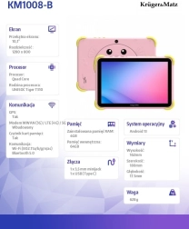 Tablet Krüger&Matz Fun este proiectată special pentru copii, oferind nu numai distracție, dar și oportunități de învățare. Datorită ecranului IPS de 10,1" cu culori vii, copiii se pot bucura de filme, jocuri și desen. Caracteristicile de siguranță ale designului asigură rezistența la șocuri și căderi, ideal pentru utilizarea zilnică.