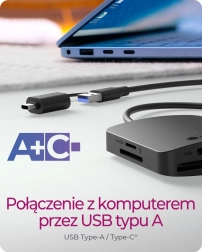 Conexiune universală: Dispozitivul este echipat cu cabluri USB Tip-A și Tip-C pentru o mai mare flexibilitate și confort. Adaptează-te la diferite opțiuni de conectare fără a fi nevoie de adaptoare suplimentare.