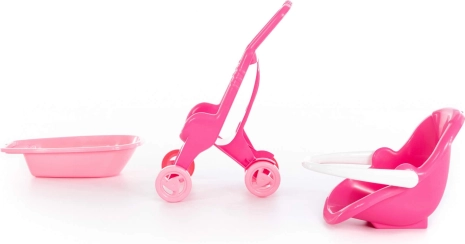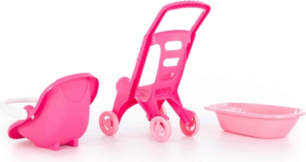 Cauți jucăria perfectă pentru micuța mămică? Acest set roz pentru păpuși include un cărucior, un scaun auto și o cădiță pentru un joc de îngrijire realist. Ușor, rezistent și simplu de transportat, ideal pentru joaca acasă și în călătorii.