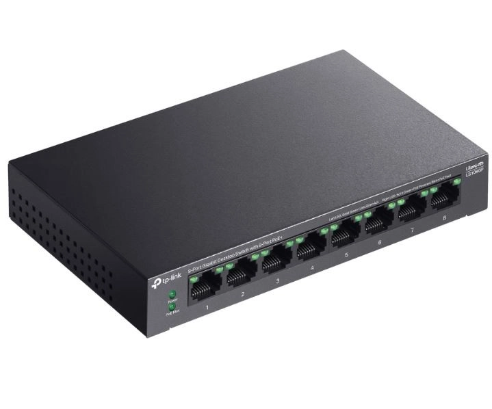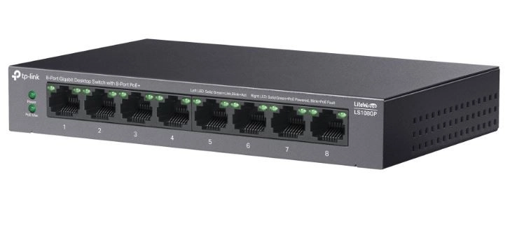 Comutator modern și performant cu 8 porturi gigabit, ideal pentru firme mici și mijlocii care au nevoie de o soluție de rețea fiabilă și eficientă, cu posibilitatea de alimentare PoE.