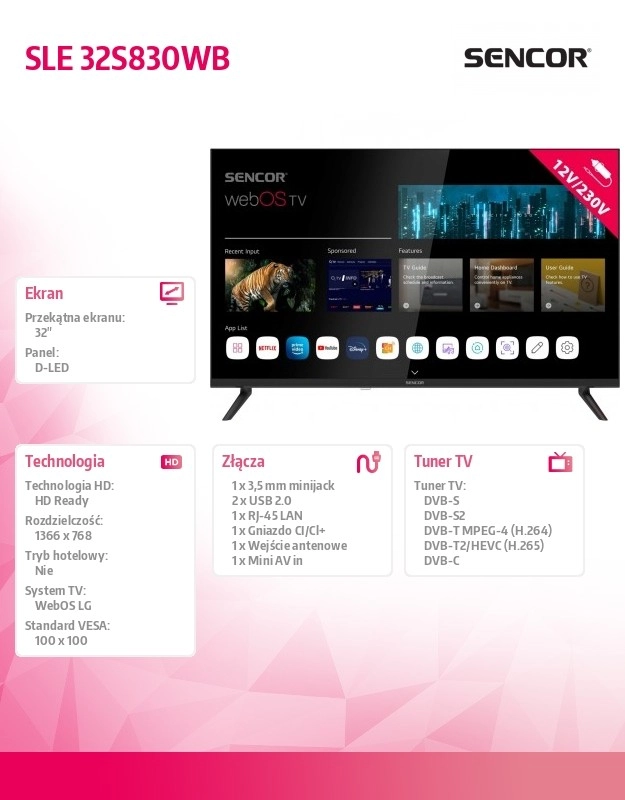 Practica alimentare duală 230 V / 12 V (adaptor în pachet) îți extinde posibilitățile de utilizare – ideal pentru rulotă, barcă sau casă de vacanță. Conectivitatea bogată cu 3× HDMI (1× ARC, CEC), 2× USB, LAN, CI+ și ieșire 3,5 mm îți permite să conectezi consolă, disc și soundbar. Sunetul cu suport Dolby Digital Plus și putere totală de 18 W oferă volum solid și claritatea dialogurilor.