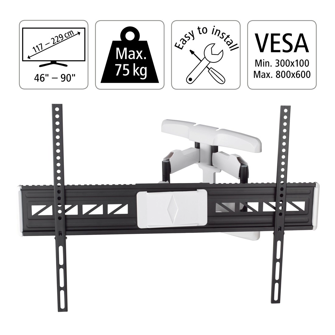 Suportă televizoare cu diagonale de la 46" la 90" și standarde VESA de la 300x100 la 800x600 mm.
