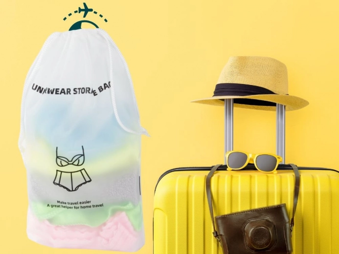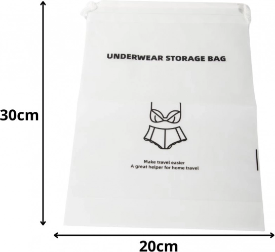 Organizator de călătorie ușor și impermeabil pentru lenjerie, din PEVA. Păstrează lenjeria uscată și ordonată, cu șnur de strângere. Dimensiuni 30 × 20 cm.
