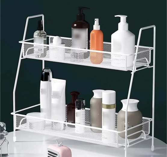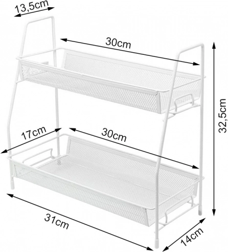 Organizator metalic stil loft pe două niveluri, elegant, care ajută la menținerea ordinii în bucătărie și baie. Oferă o construcție stabilă, rafturi aerisite din plasă și picioare cauciucate pentru siguranță pe blatul de lucru. Ideal ca suport pentru condimente, uleiuri, borcănele sau organizator pentru cosmetice și mărunțișuri.