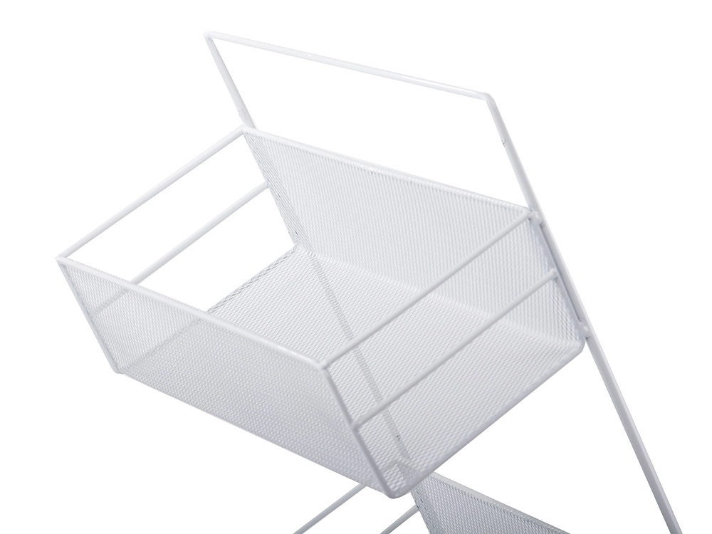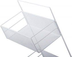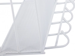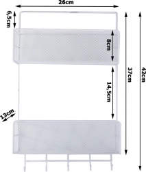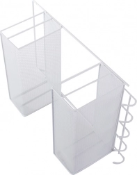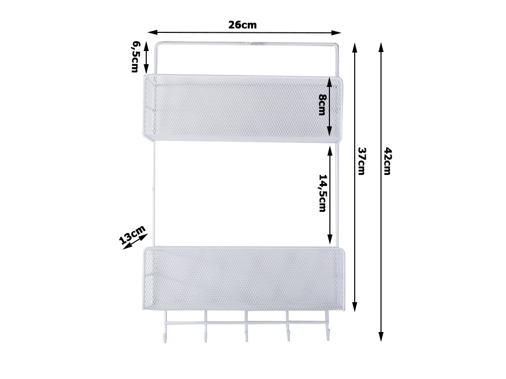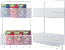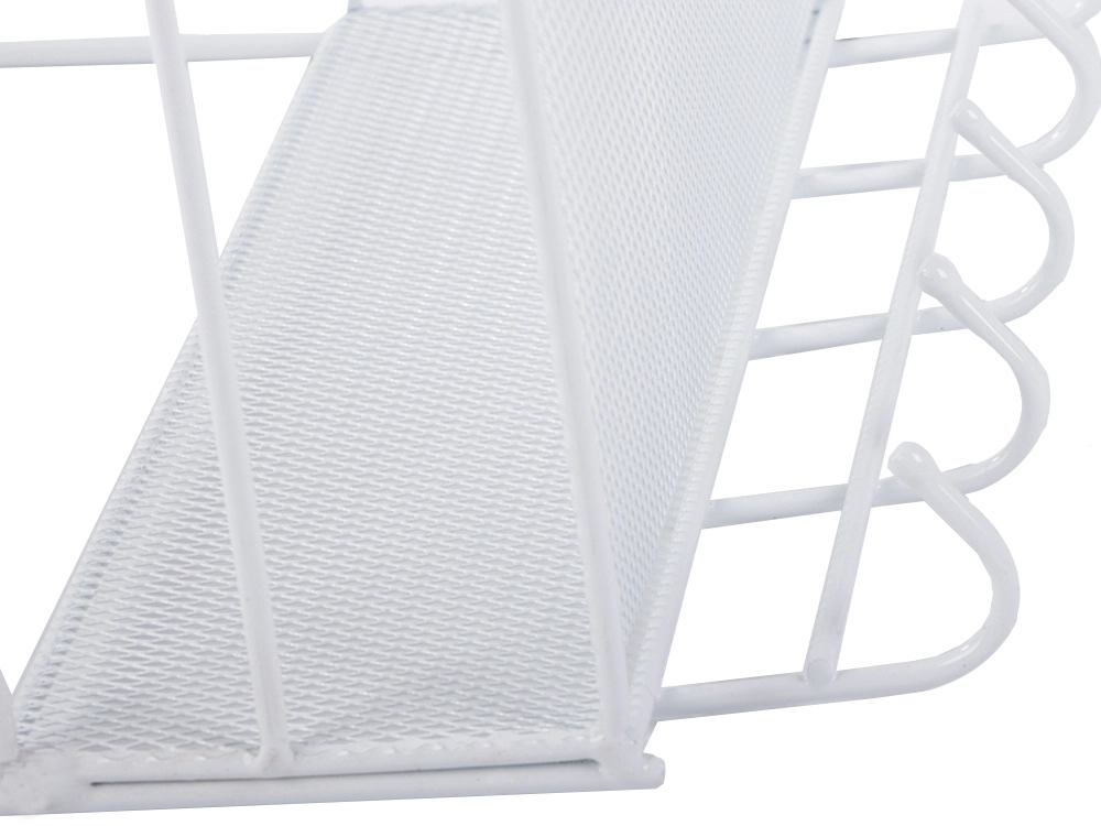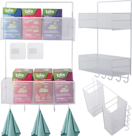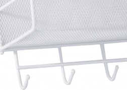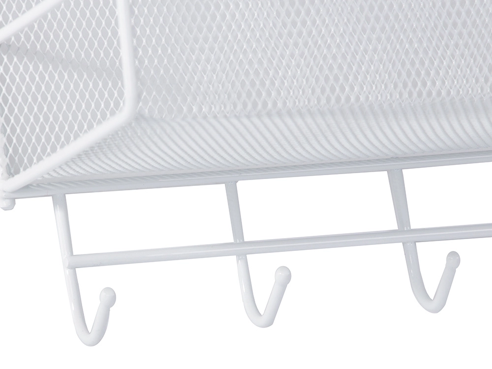 Organizator metalic de perete practic, cu două rafturi și cârlige inferioare, care ajută la menținerea ordinii în baie, bucătărie și hol. Datorită structurii aerisite din plasă și montajului fără găurire pe suporturi adezive, oferă fixare rapidă, circulație excelentă a aerului și execuție durabilă în culoare albă universală.