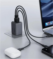- Oferă până la încărcare de trei ori mai rapidă datorită tehnologiei GaN