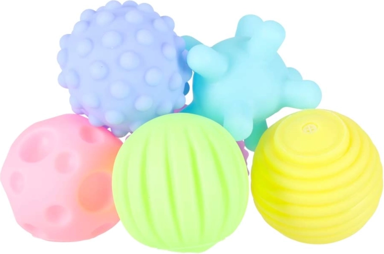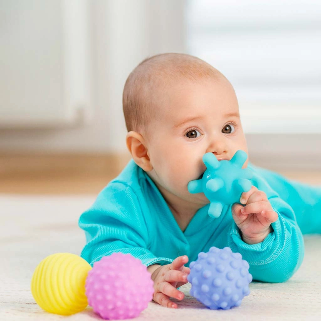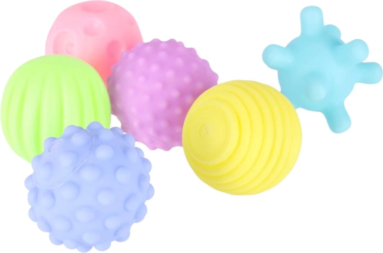 Fiecare mingiuță are o altă suprafață – proeminențe, adâncituri, dungi sau țepi – care susțin percepția tactilă și îi ajută pe copii să descopere stimuli noi.