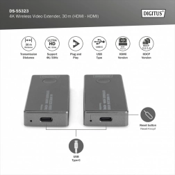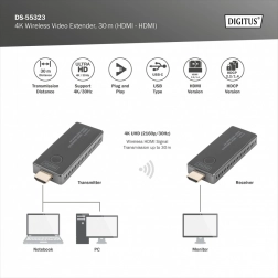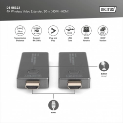 Bucurați‑vă de imagine clară și sunet curat fără cabluri. Acest set de transmițător și receptor transmite wireless semnalul HDMI la rezoluție de până la 4K/30 Hz pe o distanță de până la 30 de metri (în vizibilitate directă). Ideal pentru conectarea laptopului, set‑top boxului sau playerului la TV, proiector ori monitor.