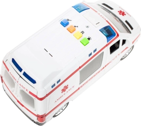 La apăsarea butoanelor colorate, ambulanța activează efecte luminoase și sunete de motor, sirenă și claxon, care transformă fiecare cursă într-o intervenție plină de acțiune.