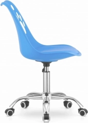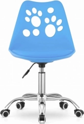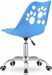 Scaun rotativ albastru din plastic cu bază metalică și decupaje decorative sub formă de lăbuțe, ideal pentru birouri de acasă sau camere pentru copii.