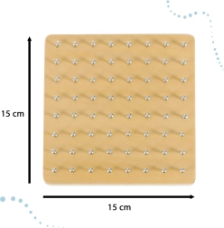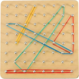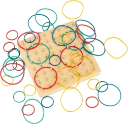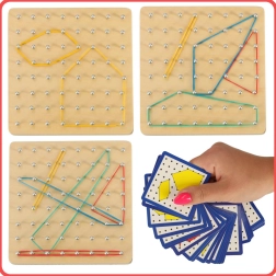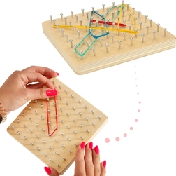 Descoperiți un mod distractiv de a-i familiariza pe copii cu bazele matematicii – forme, unghiuri și simetrie. Pe placa din lemn cu o rețea de pivoți deasă, copiii întind elastice de diferite lungimi și culori și creează modele după carduri sau după propria imaginație. Jocul dezvoltă coordonarea ochi–mână, concentrarea și gândirea logică.