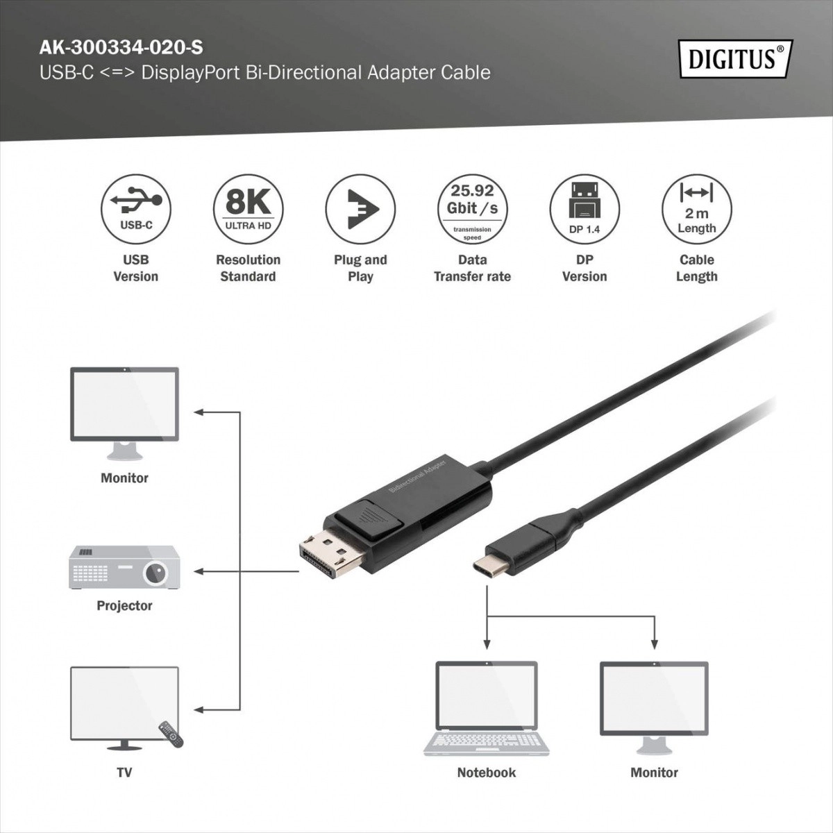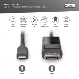 Adaptor cablu bidirecțional USB tip C - DisplayPort de la Digitus suportă transmisia atât de la USB tip C la DisplayPort, cât și invers. Cu ajutorul acestui cablu, puteți conecta de exemplu un laptop cu port USB-C la un monitor cu interfață DisplayPort sau un desktop cu ieșire DisplayPort la un monitor cu port USB-C. Acest adaptor este complet alimentat prin USB, eliminând necesitatea unei alimentări externe.