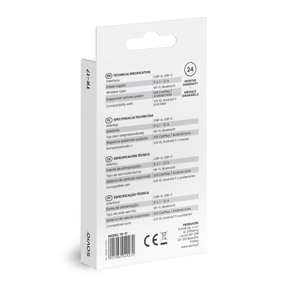 Adaptorul wireless Savio TR-17 vă permite să folosiți aplicațiile preferate, navigația, muzica și controlul vocal prin CarPlay și Android Auto fără a conecta telefonul prin cablu. Transmite date prin Wi‑Fi și se împerechează prin Bluetooth, astfel încât pornirea și reconectarea sunt rapide și fiabile.
