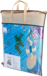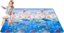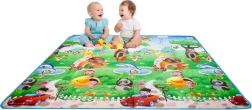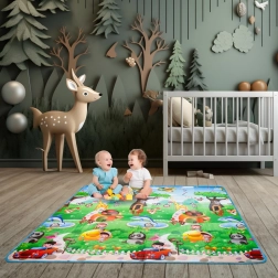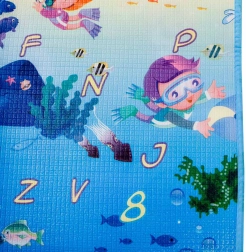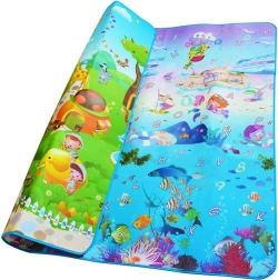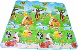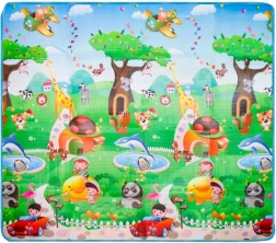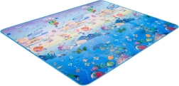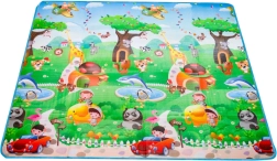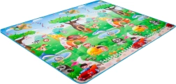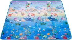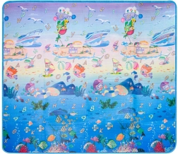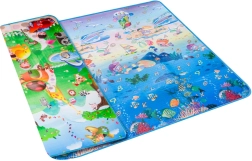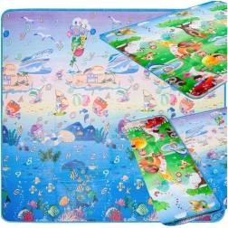 Saltea de joacă din spumă, dublu-față, pentru copii oferă un loc moale și sigur pentru joacă și învățare. O față ilustrează lumea mărilor cu litere și cifre, cealaltă o grădină zoo veselă. Salteaua izolează de frig, amortizează căderile și se curăță ușor – este suficient să o ștergeți cu o lavetă umedă.