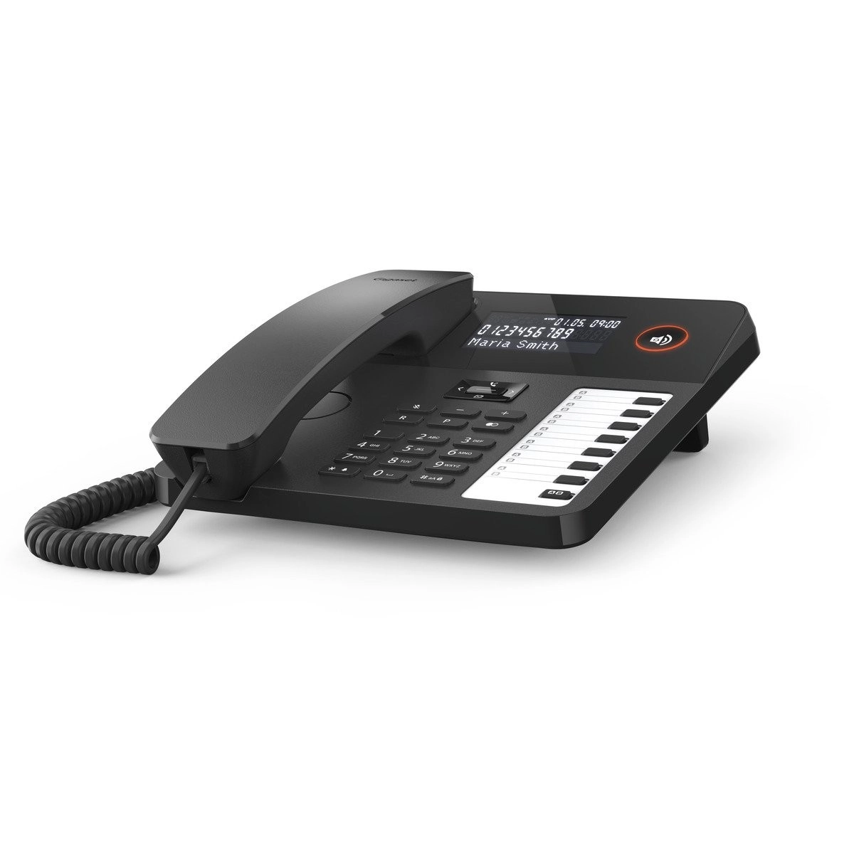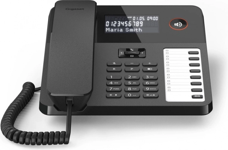 Telefonul Gigaset Desk 600 este alegerea ideală pentru utilizare atât acasă, cât și la birou. Datorită ecranului LCD iluminat pe trei rânduri, telefonul afișează informații despre apel, precum ora, numele, numărul sau statutul VIP al apelantului. Ecranul principal afișează data, ora și ziua săptămânii.