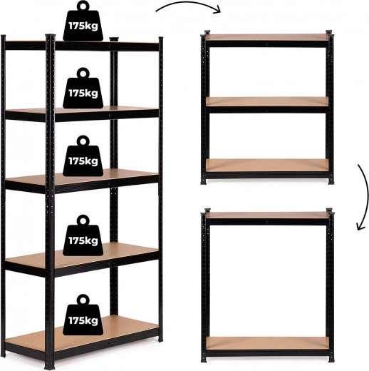 Raftul conține 5 polițe solide, care pot fi montate la orice înălțime, în funcție de nevoile dumneavoastră. Fiecare poliță are un suport central adițional pentru a asigura stabilitate. Blaturile polițelor sunt fabricate din plăci MDF durabile, rezistente la deteriorări mecanice și presiune, asigurând o utilizare pe termen lung, fără probleme.