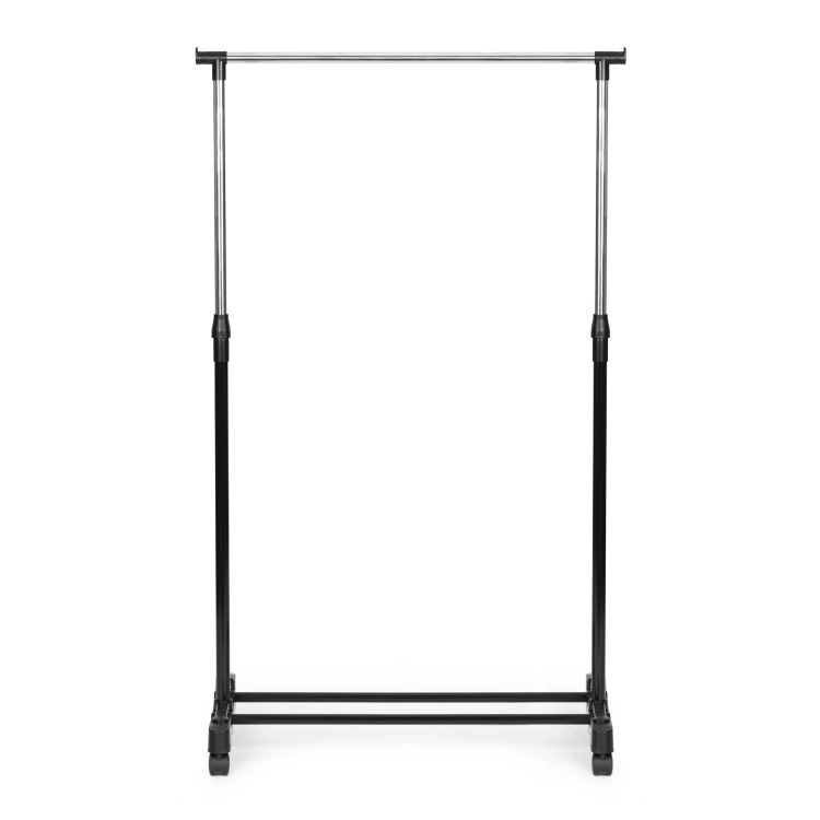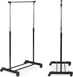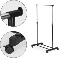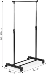 Piesele de pe capetele barei de susținere a suportului asigură siguranța și elimină riscul alunecării nedorite și a deteriorării hainelor. Bara servește și ca cârlig pentru atârnarea genților, eșarfelor, pălăriilor și altor mărunțișuri. Suportul este echipat cu patru roți, dintre care două sunt blocabile. Acest lucru permite o mișcare ușoară și o organizare flexibilă a spațiului. Este o soluție practică care permite adaptarea ușoară a suportului la nevoile dumneavoastră.