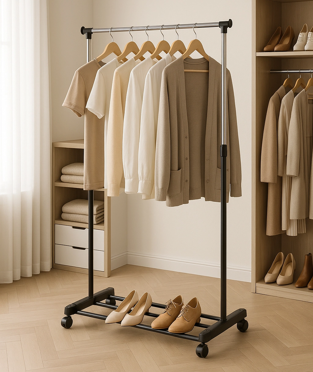 Acest suport de haine autonom este o modalitate practică de a păstra hainele și încălțămintea, devenind astfel un accesoriu excelent pentru orice dressing, dormitor sau hol din casa sau apartamentul dumneavoastră. Datorită designului universal, se potrivește atât cu interioare moderne, cât și clasice, oferind nu doar funcționalitate, ci și completarea estetică a decorului.