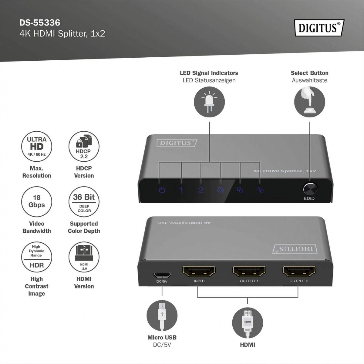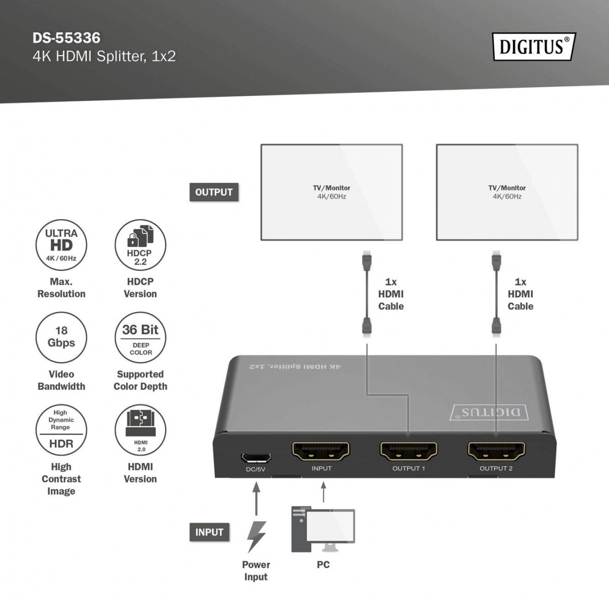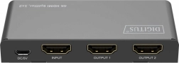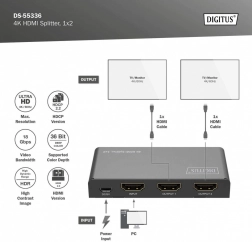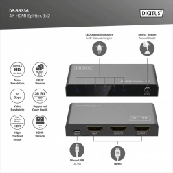 Splitterul HDMI DIGITUS împarte sau duplică semnalele audio și video de la dispozitivele HDMI către două ieșiri, permițând afișarea pe mai multe ecrane simultan. Datorită funcției de downscaling suportă afișarea 4K pe ecrane Full HD, permițând utilizarea simultană a ecranelor 4K și Full HD.