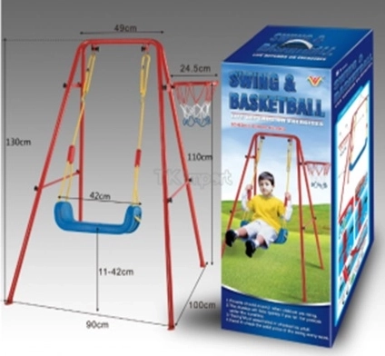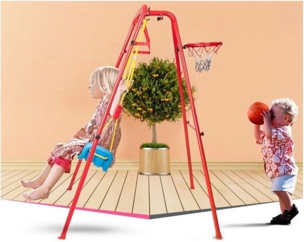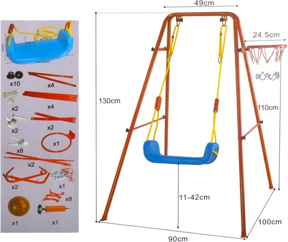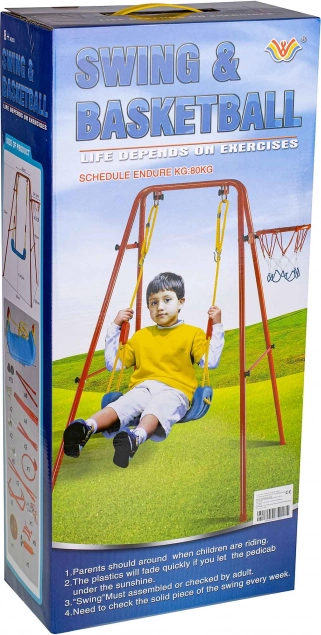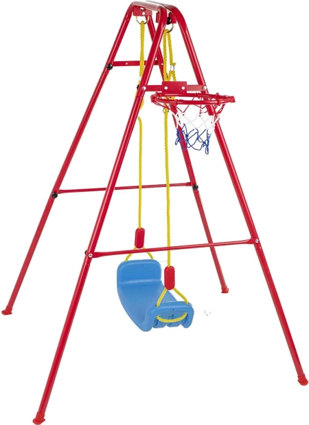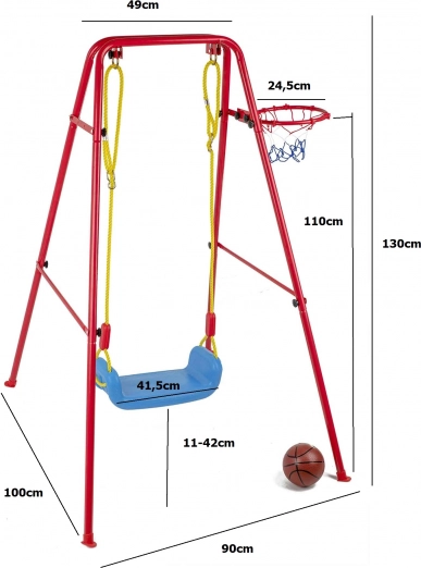 Acest leagăn de grădină versatil combină legănatul îndrăgit cu distracția baschetului. Cadrul metalic stabil, cu diametrul țevilor de cca 2,5 cm, și frânghia solidă susțin șezutul din plastic lat (cca 43 × 25,5 cm) pentru o utilizare confortabilă și sigură. Include coș de baschet ușor de fixat pe cadru, precum și mini minge și pompă pentru joacă imediată.