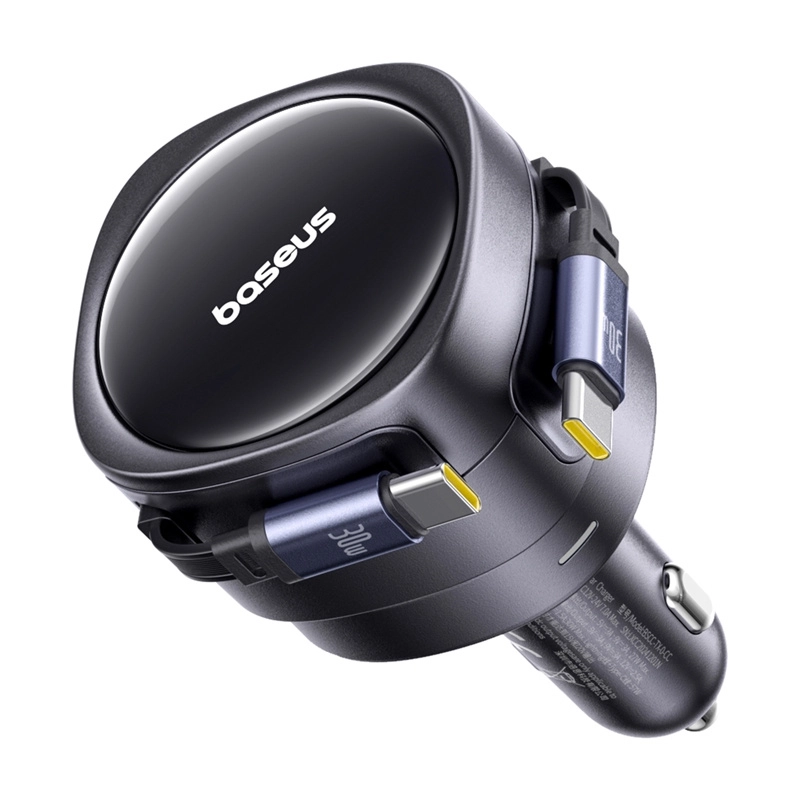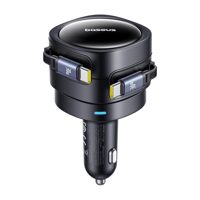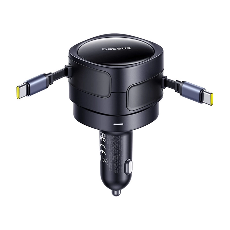 Încărcătorul auto Baseus oferă un design compact și elegant, ideal pentru utilizarea versatilă în automobil. Cu cablurile USB-C de 80 cm lungime, permite încărcarea a două dispozitive simultan fără cabluri încâlcite datorită mecanismului rotativ până la 180°.
