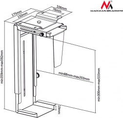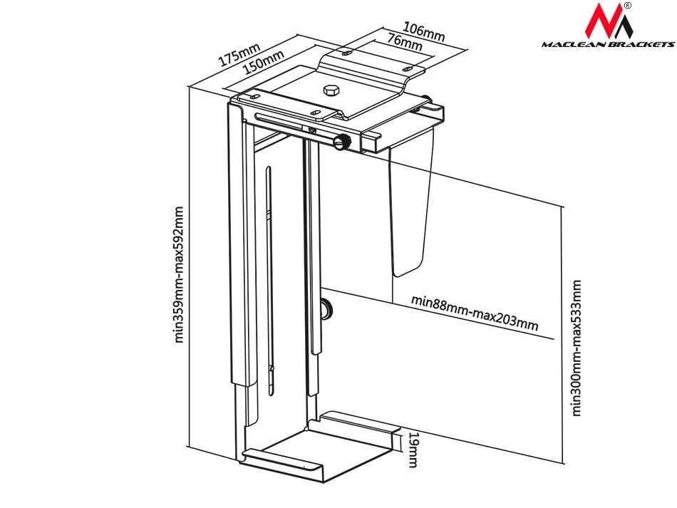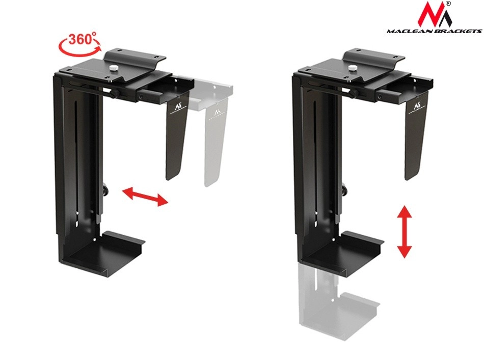 Suportul pentru calculator Maclean MC-713 B este conceput pentru a utiliza eficient spațiul disponibil de lucru și, în același timp, pentru a menține calculatorul la îndemână. Construcția sa permite montajul pe orice formă de șasiu cu o lățime maximă de 203mm, făcându-l universal pentru majoritatea modelelor.