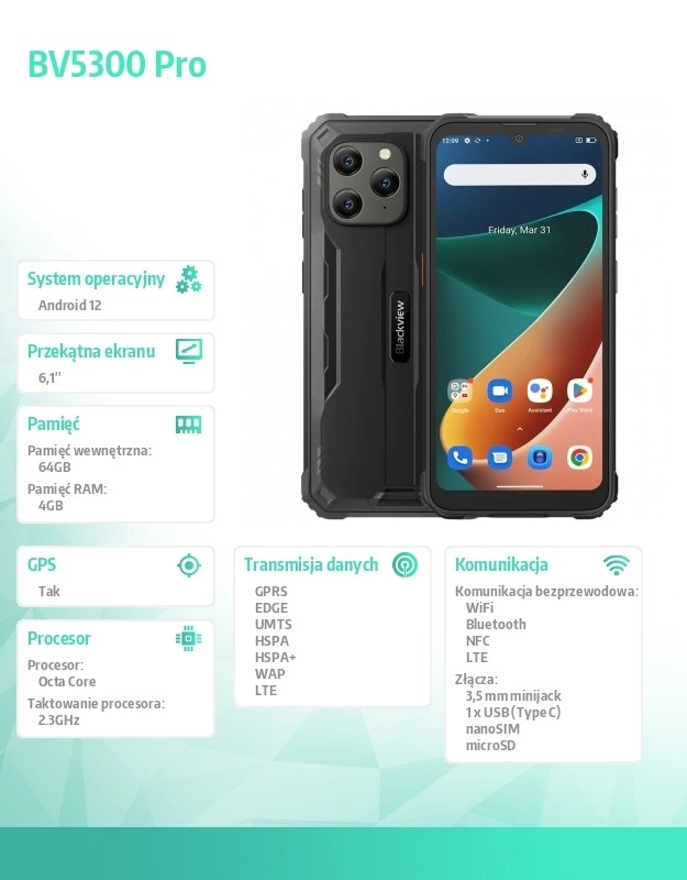 Blackview BV5300 Pro se remarcă prin display-ul său de 6,1" IPS, care oferă imagini clare și detaliate, cu o rezoluție de 1560 x 720 pixeli. Procesorul său octa-core MediaTek Helio P35 atinge o viteză de până la 2,3 GHz, asigurând o funcționare rapidă și fluidă a sistemului, susținut de 4 GB RAM și 64 GB memorie internă. Memoria poate fi extinsă cu ajutorul unui card microSD de până la 512 GB, oferind suficient spațiu pentru toate nevoile tale.