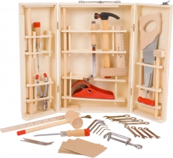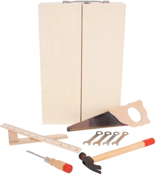 O valiză de lemn cu scule care conține tot ce îi trebuie unui tânăr meșter. Conține șurubelnițe, ferăstraie, chei, ciocane și multe alte unelte. Fabricat din materiale de înaltă calitate și respectă normele europene de siguranță.