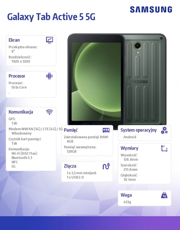 Samsung Galaxy Tab Active5 5G este o tabletă robustă și durabilă, ideală pentru utilizarea în afaceri. Cu funcții avansate și hardware performant, se adaptează diferitelor medii de lucru.