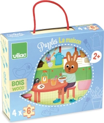Aceste puzzle-uri drăgălașe din lemn VILAC, cu tema gospodăriei, aduc copiilor bucuria descoperirii și a asamblării. Patru imagini diferite oferă distracție variată, în timp ce cutia compactă din lemn cu mâner facilitează transportul și depozitarea.