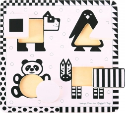 Puzzle-ul de inserție alb-negru BIGJIGS TOYS este conceput special pentru cei mai mici copii. Contrastul ajută bebelușii să focalizeze mai bine și să perceapă formele, în timp ce cele patru piese mari din lemn, cu motive de animăluțe, se introduc ușor în decupajele corespunzătoare.