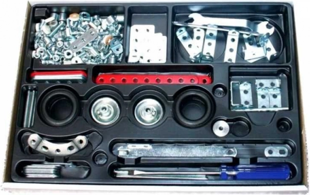 Setul de construcții conține 230 de piese metalice, inclusiv șuruburi, piulițe și alte componente aranjate într-o tavă neagră.