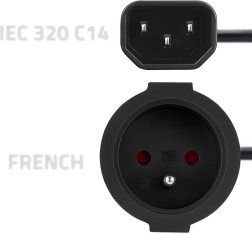 - IEC 320 C14 (intrare) la priză Tip E/F (franceză/europeană cu pin central)