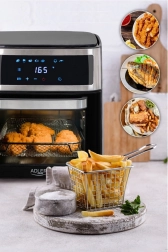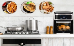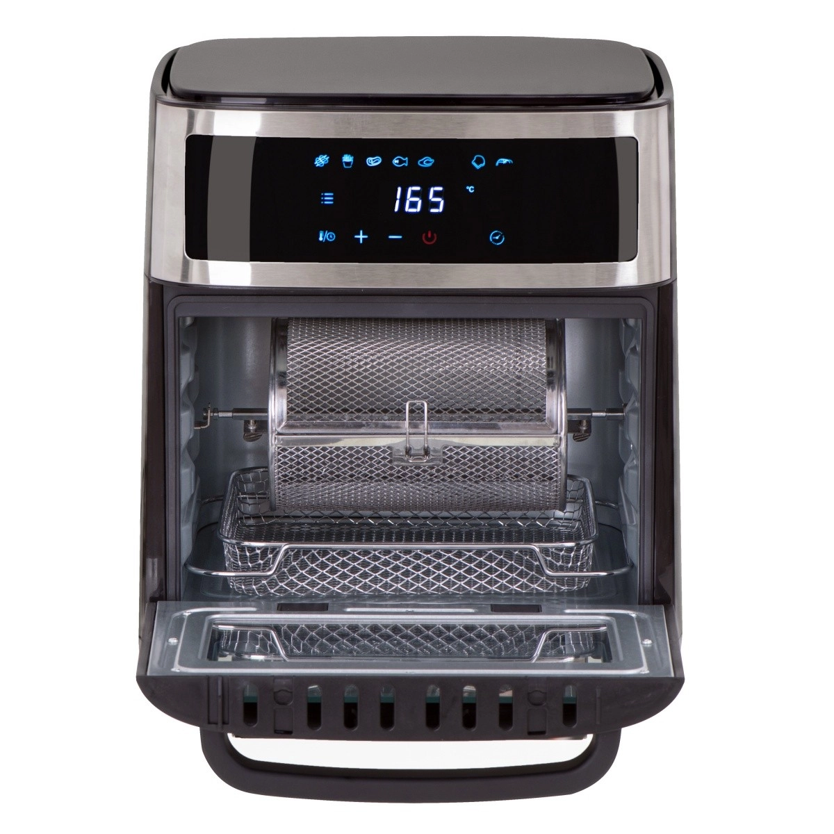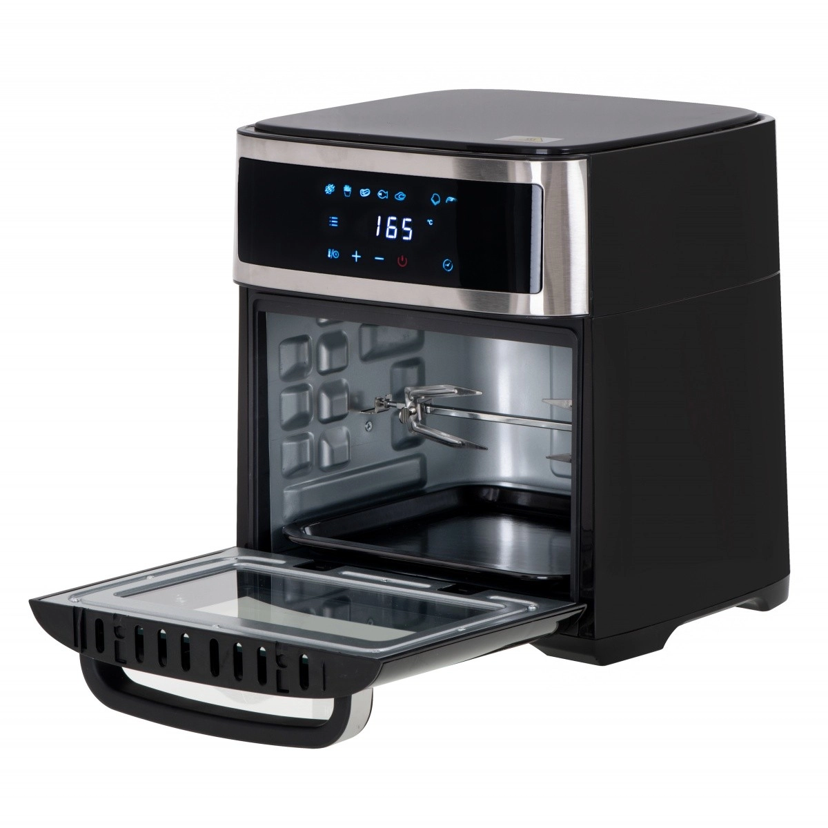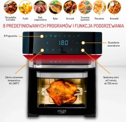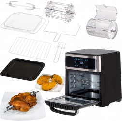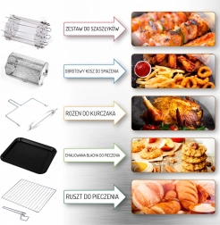 Friteuza oferă opt programe diferite pentru diferite tipuri de preparate, precum aripioare de pui, pește, creveți, fripturi și altele. În pachet sunt incluse și alte ustensile utile, cum ar fi rotisor pentru pui, tăvi de coacere sau coșuri pentru friteuză. Toate componentele sunt fabricate din materiale durabile și pot fi spălate în mașina de spălat vase.