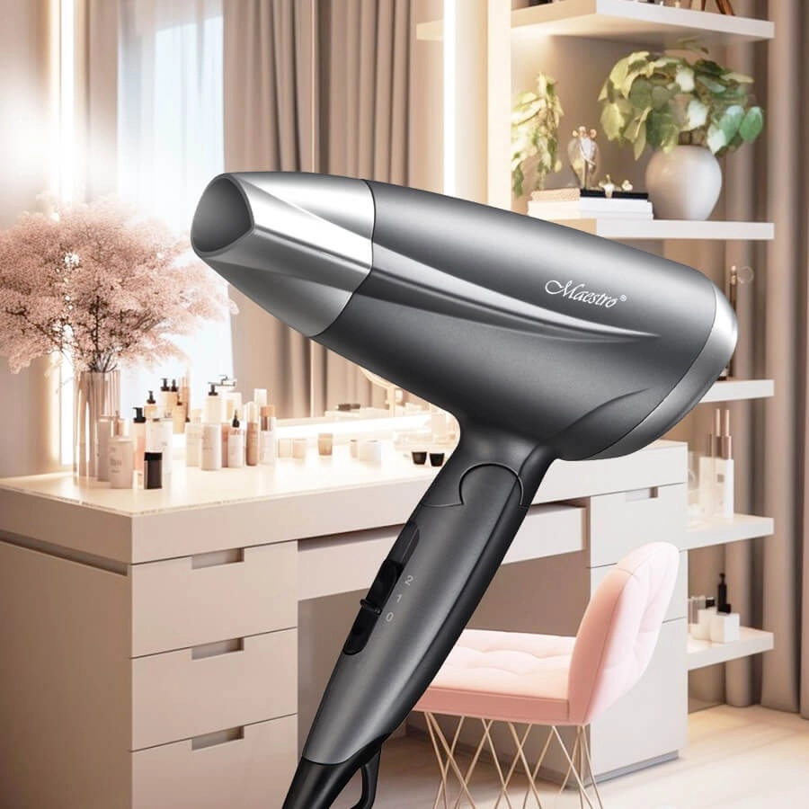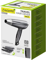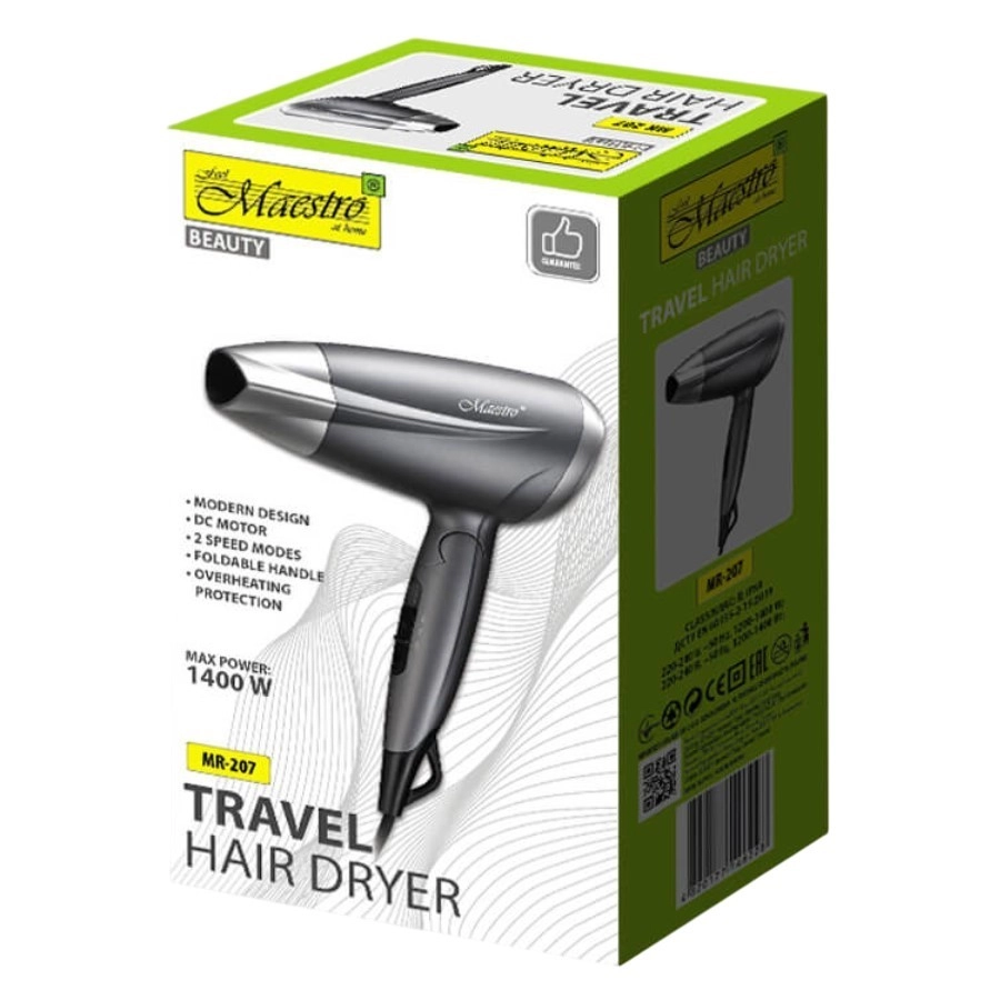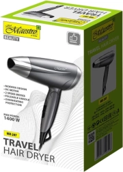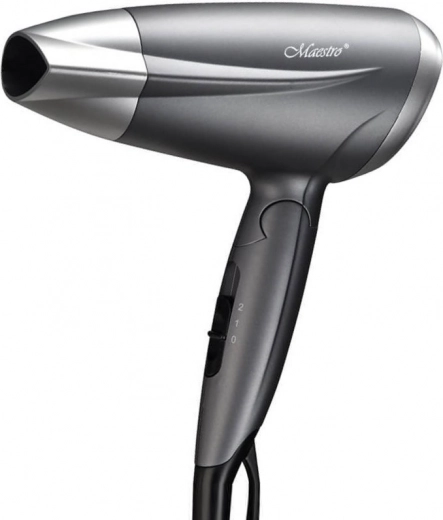 Uscătorul de păr de călătorie Maestro este echipat cu un motor DC care asigură funcționare silențioasă și durată lungă de viață. Setul include un concentrator pentru stilizare precisă și un mâner pliabil pentru depozitare și transport ușor.