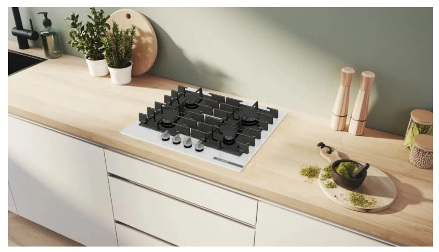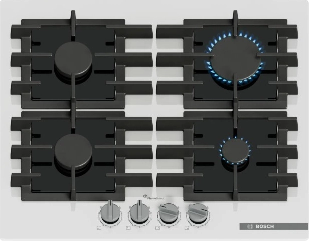 Control deplin asupra plitei pe gaz. Cu plita Bosch FlameSelect, puteți regla ușor și precis intensitatea flăcării, garantând rezultate perfecte la gătit. Sunt disponibile nouă niveluri de flacără, ideale pentru prăjire, fierbere și gătit.