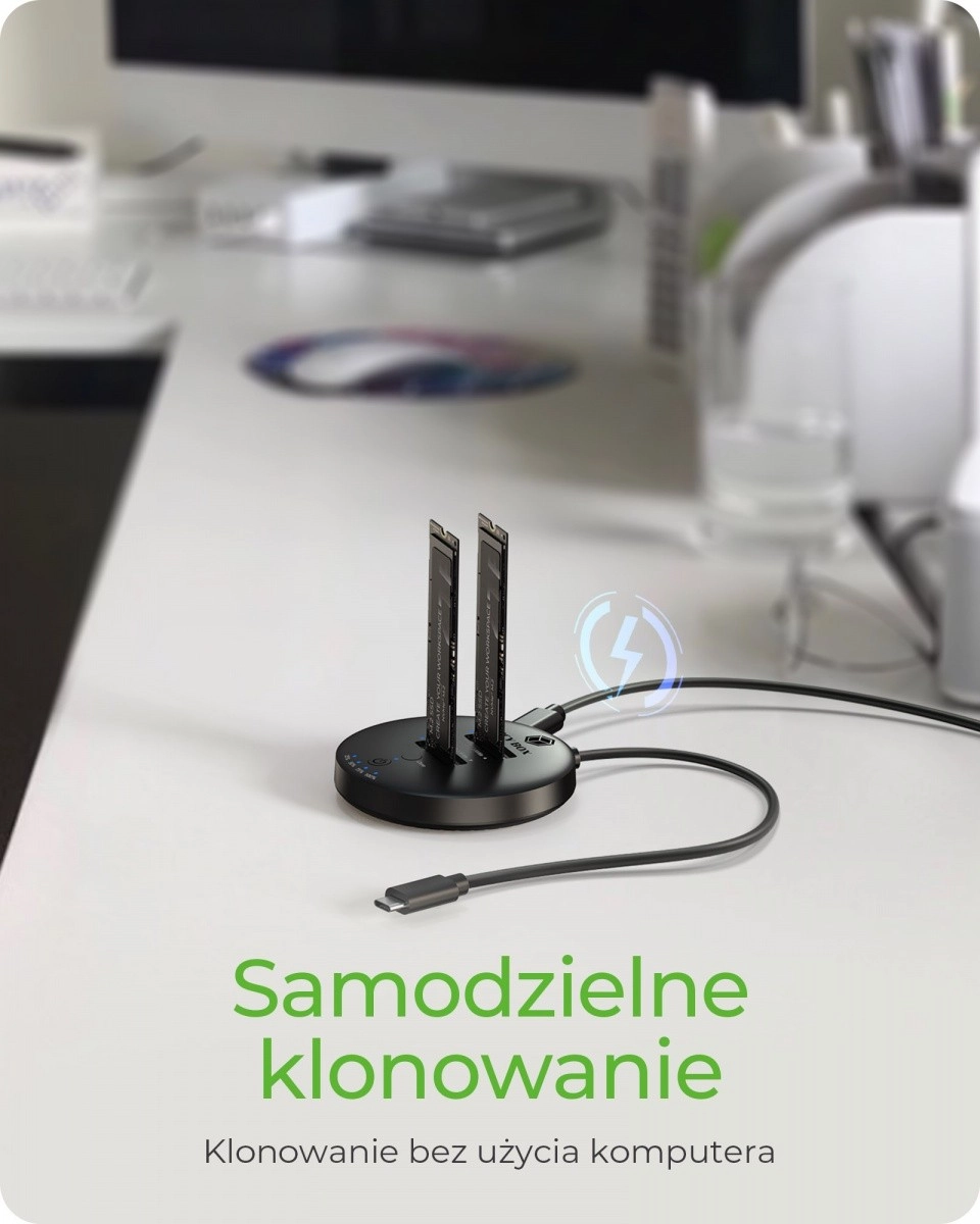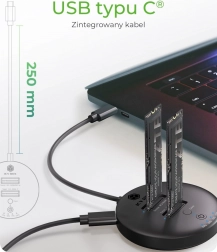 Această stație funcționează ca stație de andocare pentru două discuri SSD M.2 NVMe atunci când este conectată la un computer prin cablul USB-C integrat. Oferă transfer rapid de date între ambele discuri și suportă stocare de înaltă rezoluție și backup de sistem în timp real.