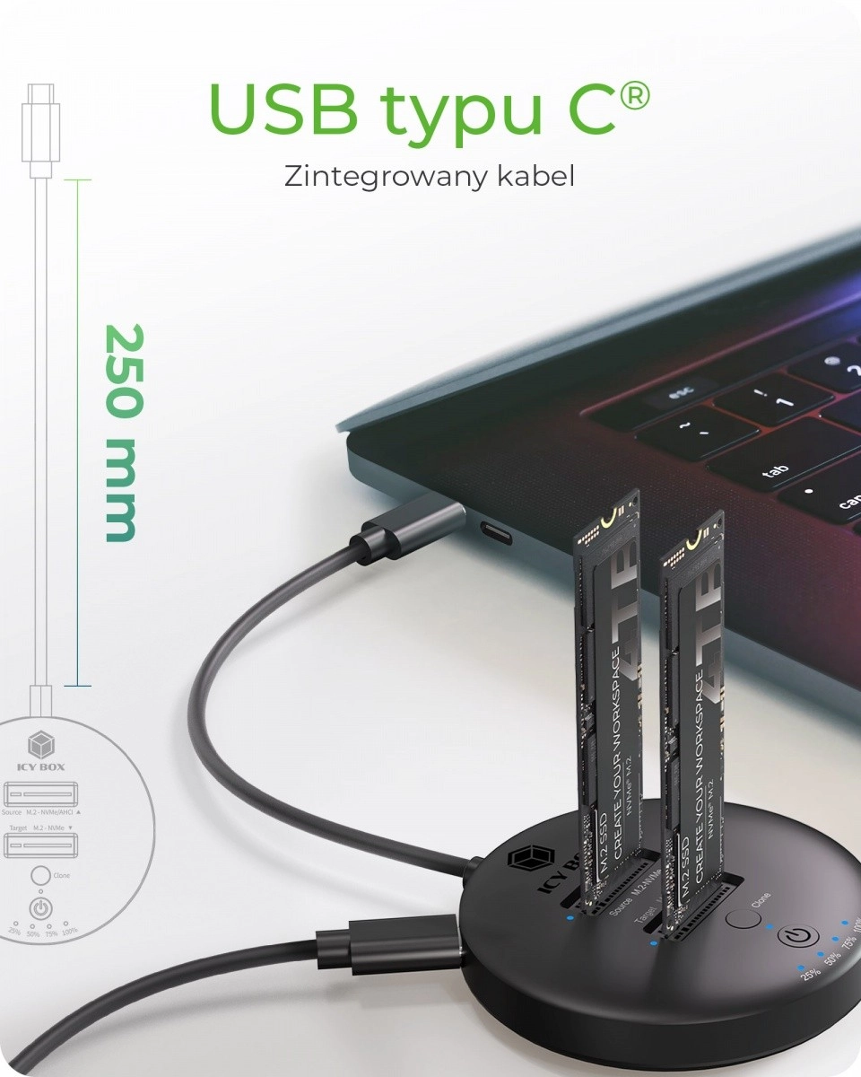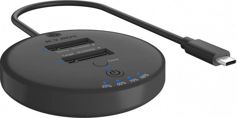 Stația IB-1612MCL-C31 vă permite clonarea independentă a discurilor fără a necesita conectarea la un computer. Pur și simplu duplicați întregul disc SSD M.2 NVMe pentru o migrație rapidă a sistemului. Indicatorii LED afișează clar progresul clonării.