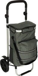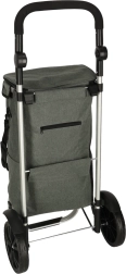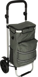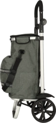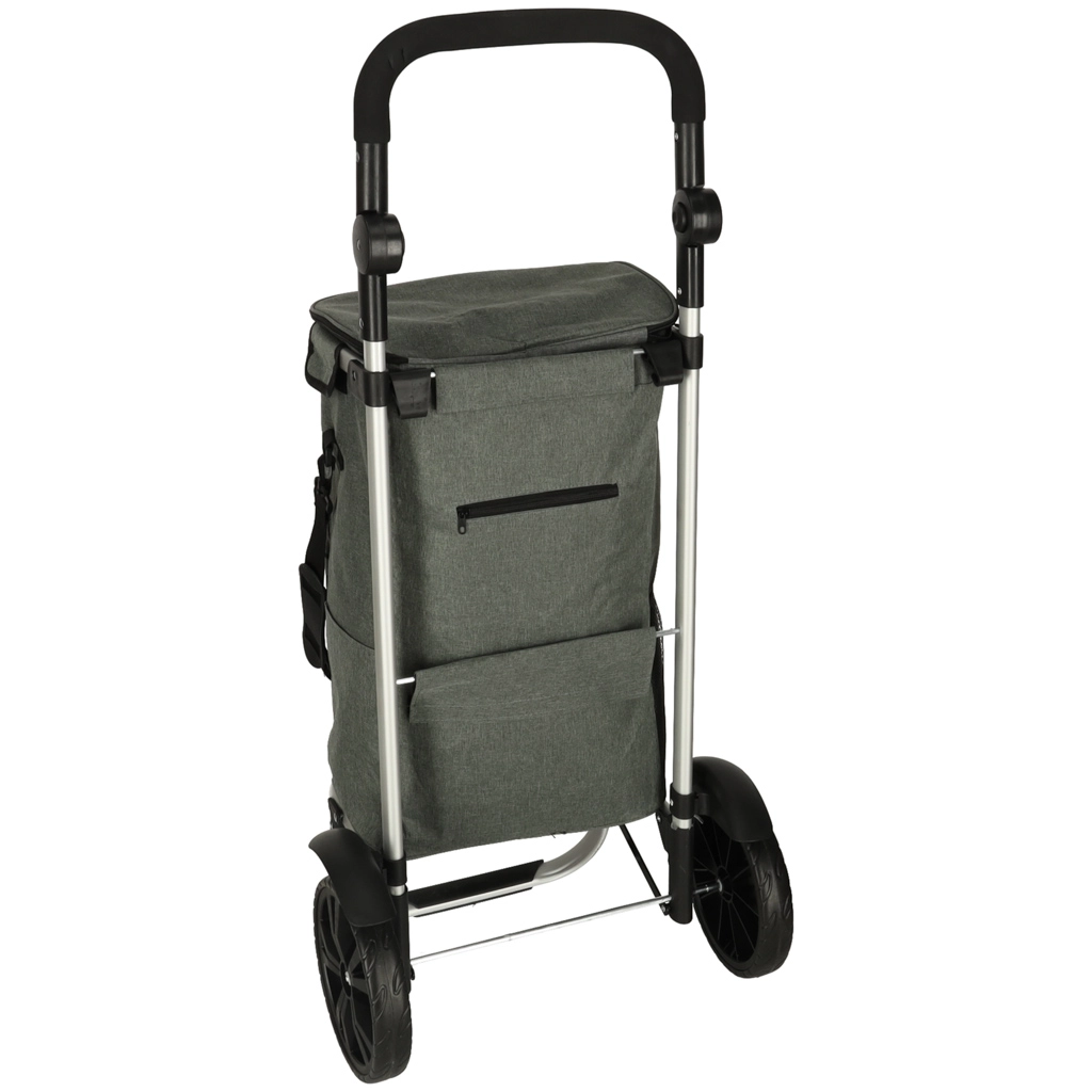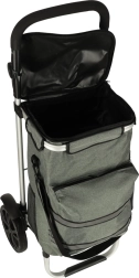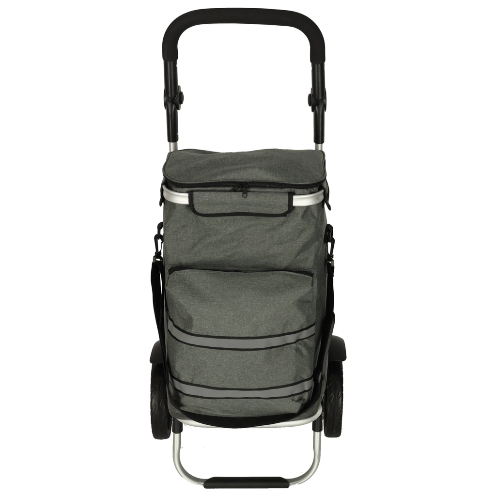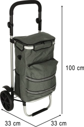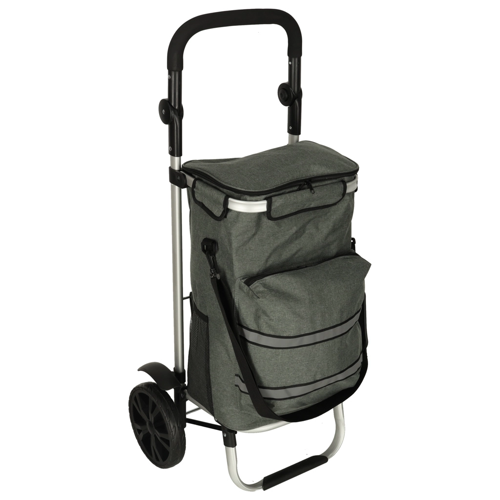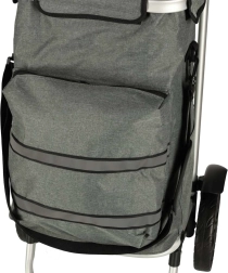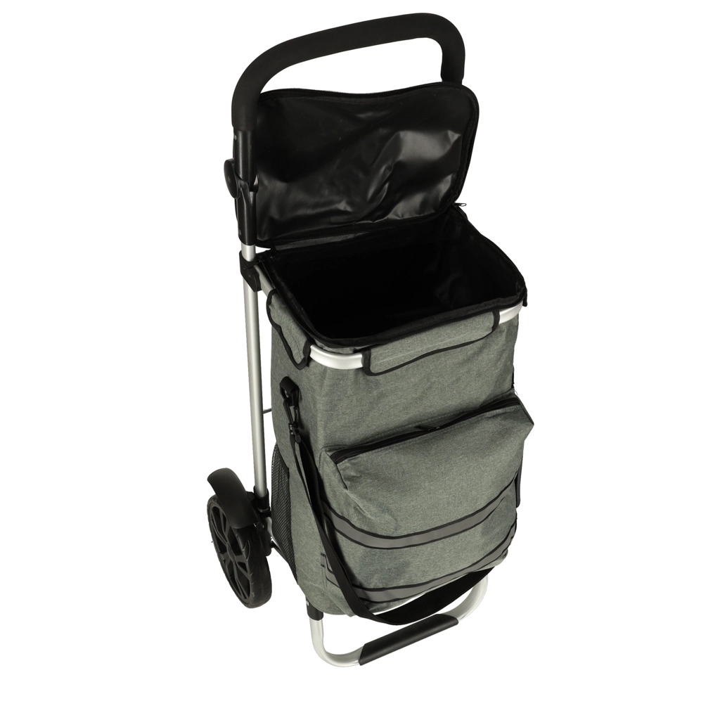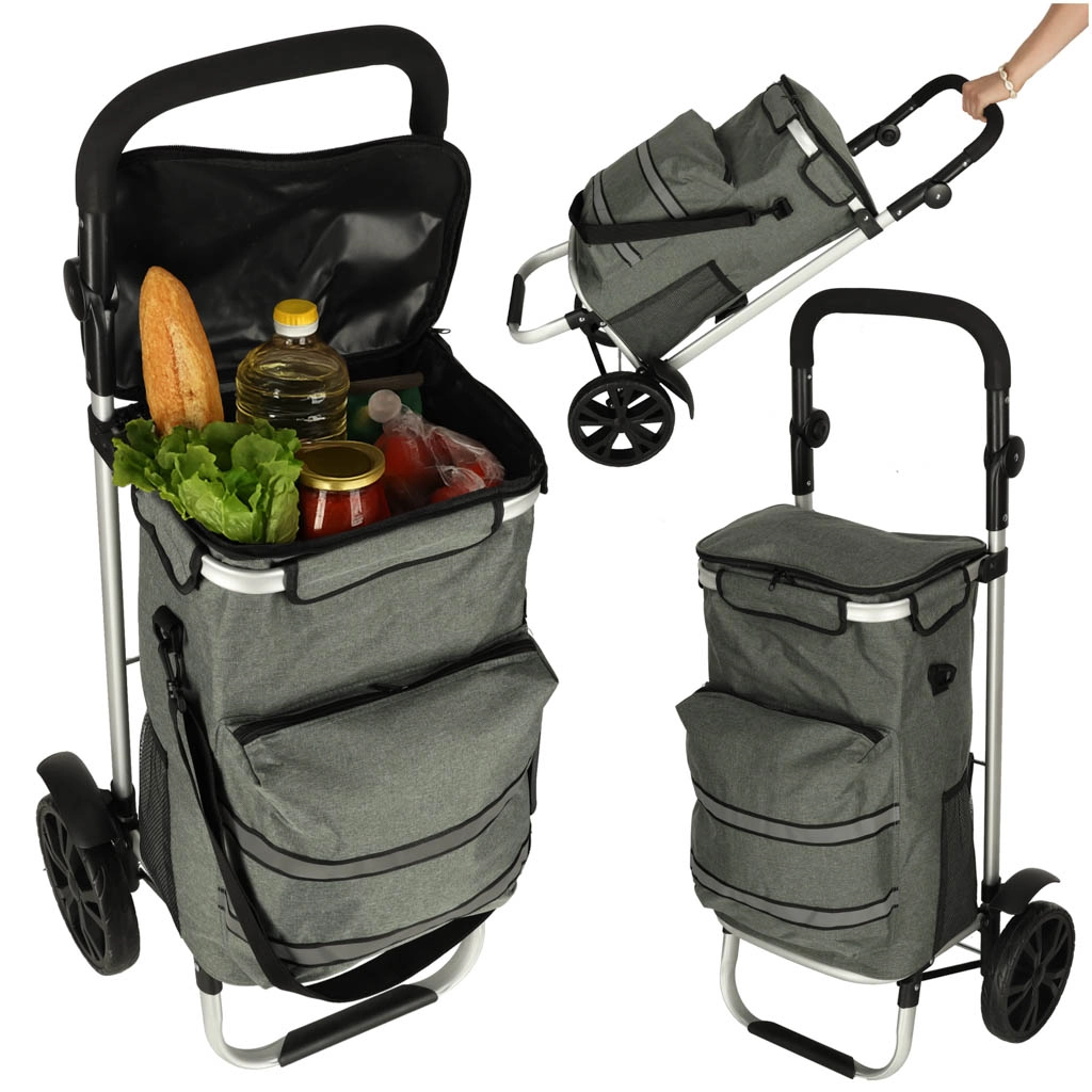Geanta practică de cumpărături pe roți, cu șasiu de 100 cm, în culoare gri elegantă, oferă volum de 40 l, buzunar termo pentru alimente refrigerate și material hidrofug. Datorită roților mari, mânerului ergonomic și elementelor reflectorizante, asigură transport confortabil și sigur al cumpărăturilor și bagajelor pe tot parcursul anului.