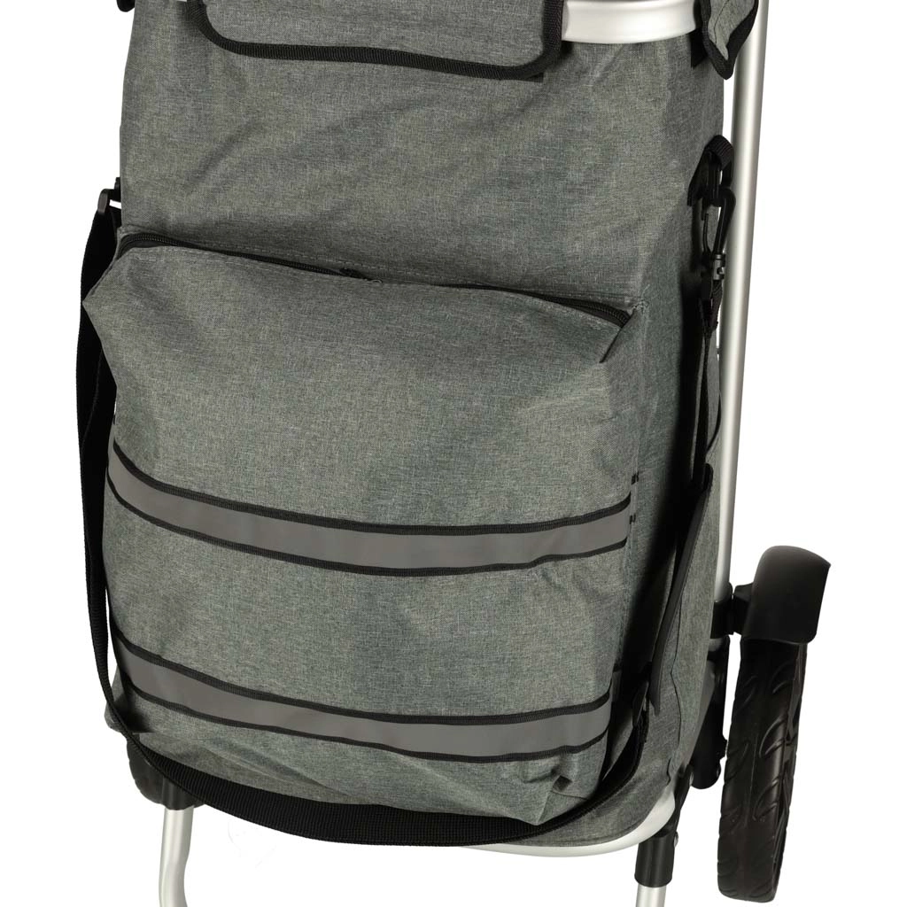 Datorită roților mari și mânerului rotativ, manevrarea este lină chiar și pe suprafețe denivelate. Benzi reflectorizante sporesc vizibilitatea la amurg, astfel încât întunericul nu vă ia prin surprindere. Geanta poate fi ușor îndepărtată de pe șasiu, ceea ce ușurează transportul și depozitarea.
