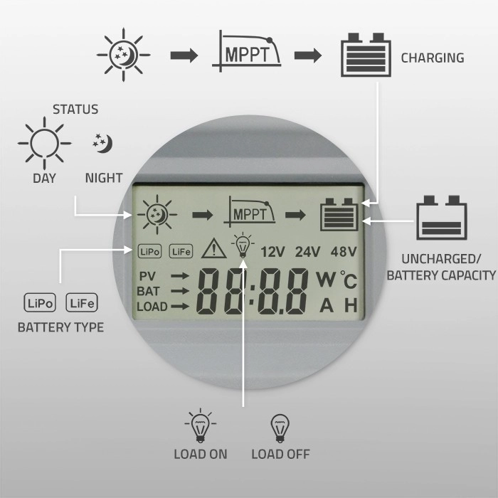 Siguranța pe primul loc: Acest regulator include o gamă largă de funcții de siguranță, cum ar fi deconectarea automată la scurtcircuit, detectarea suprasarcinilor și a polarității inversate, care protejează echipamentul și instalația.