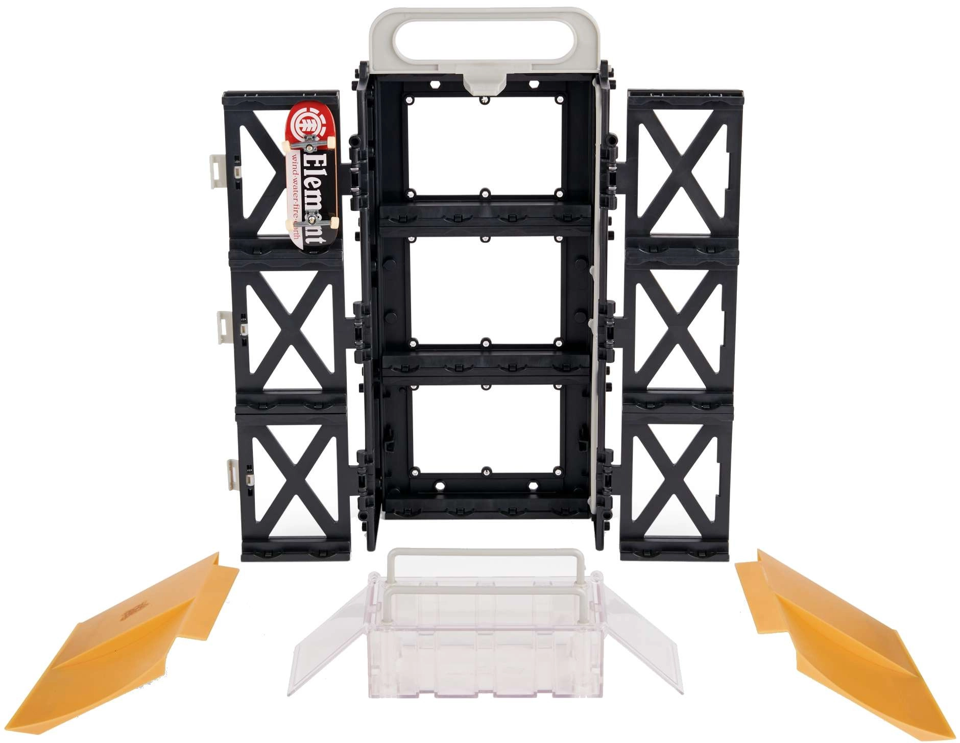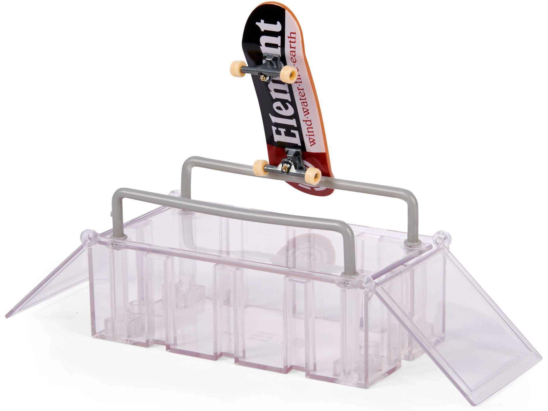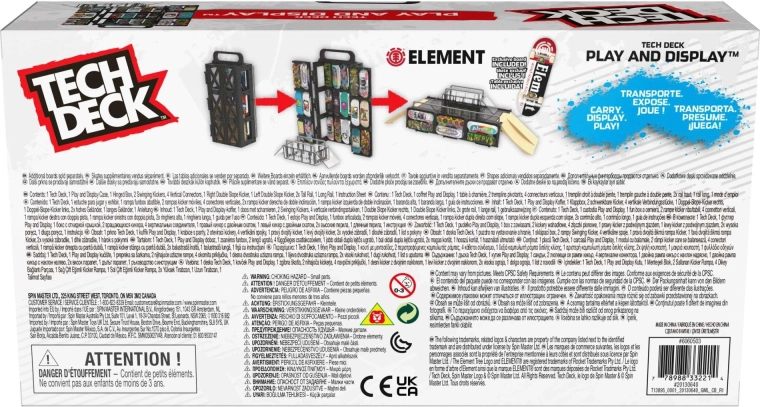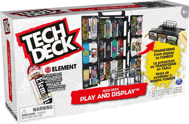 Tech Deck Play and Display este o soluție inteligentă 2 în 1: suport și husă de depozitare pentru colecția ta și skatepark complet pentru fingerboard pentru trick-uri. Construcția tip ladă se desface ușor într-un funbox cu rampe și grind rails, astfel încât poți rula acasă sau în deplasare. Include și un fingerboard stilat ELEMENT pentru mers imediat.