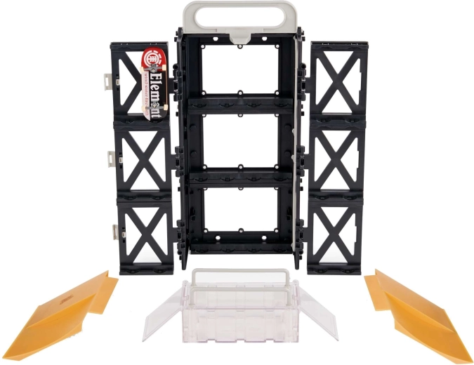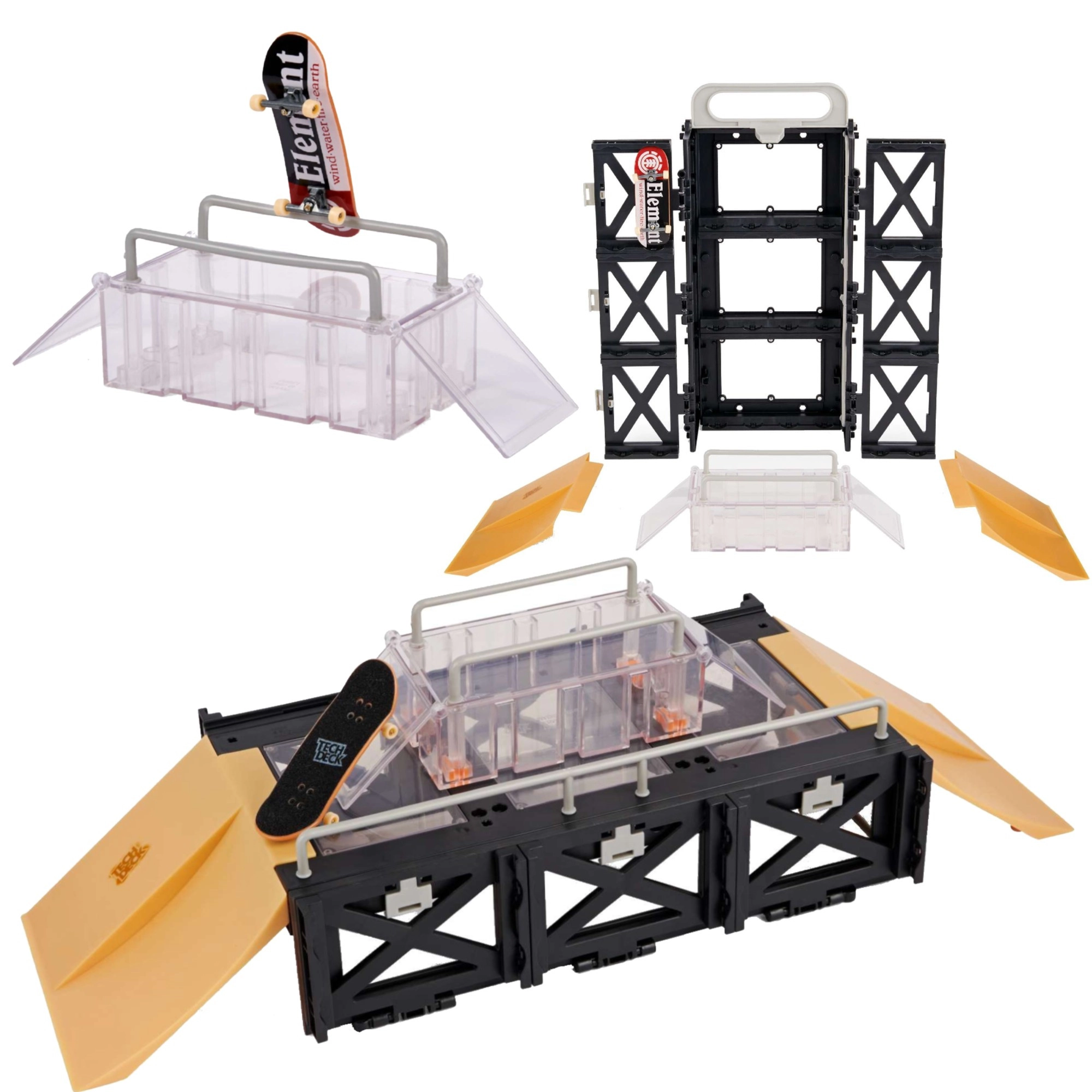 - 1× fingerboard Tech Deck ELEMENT, 1× husă/suport, cutie cu balamale, 2× kicker rabatabil, 4× conector vertical, 1× kicker drept cu coborâre dublă, 1× kicker stâng cu coborâre dublă, 2× balustrade înalte, 1× balustradă lungă, manual
