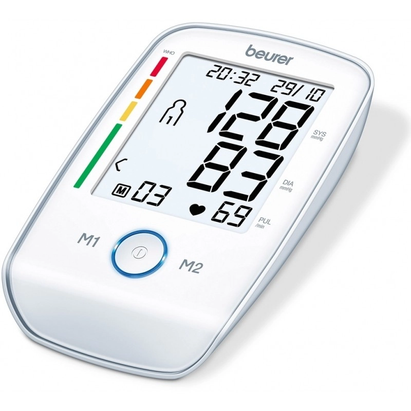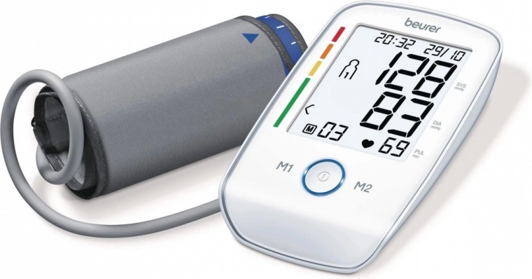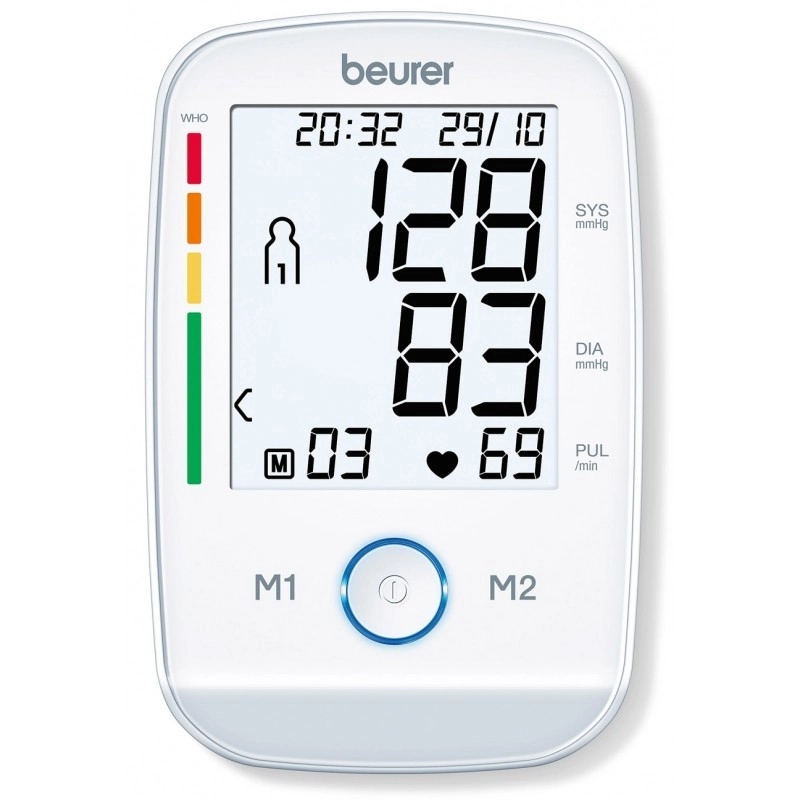 Beurer BM 45 este un tensiometru pe braț echipat cu butoane tactile și un ecran XL iluminat pentru utilizare facilă. Datorită funcției de recunoaștere a aritmiei, aparatul avertizează asupra tulburărilor posibile ale ritmului cardiac.