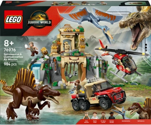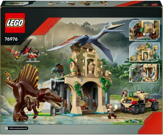 Descoperă acțiunea inspirată de film în junglă: templul antic cu cascadă ascunde un cuib cu ouă, pasaje secrete și o capcană activată cu lanț. Spinosaurus articulat (picioare, labe, coadă, cap și maxilar) și impunătorul Quetzalcoatlus (aripi și maxilar) adaugă scene realiste de urmărire și salvare.