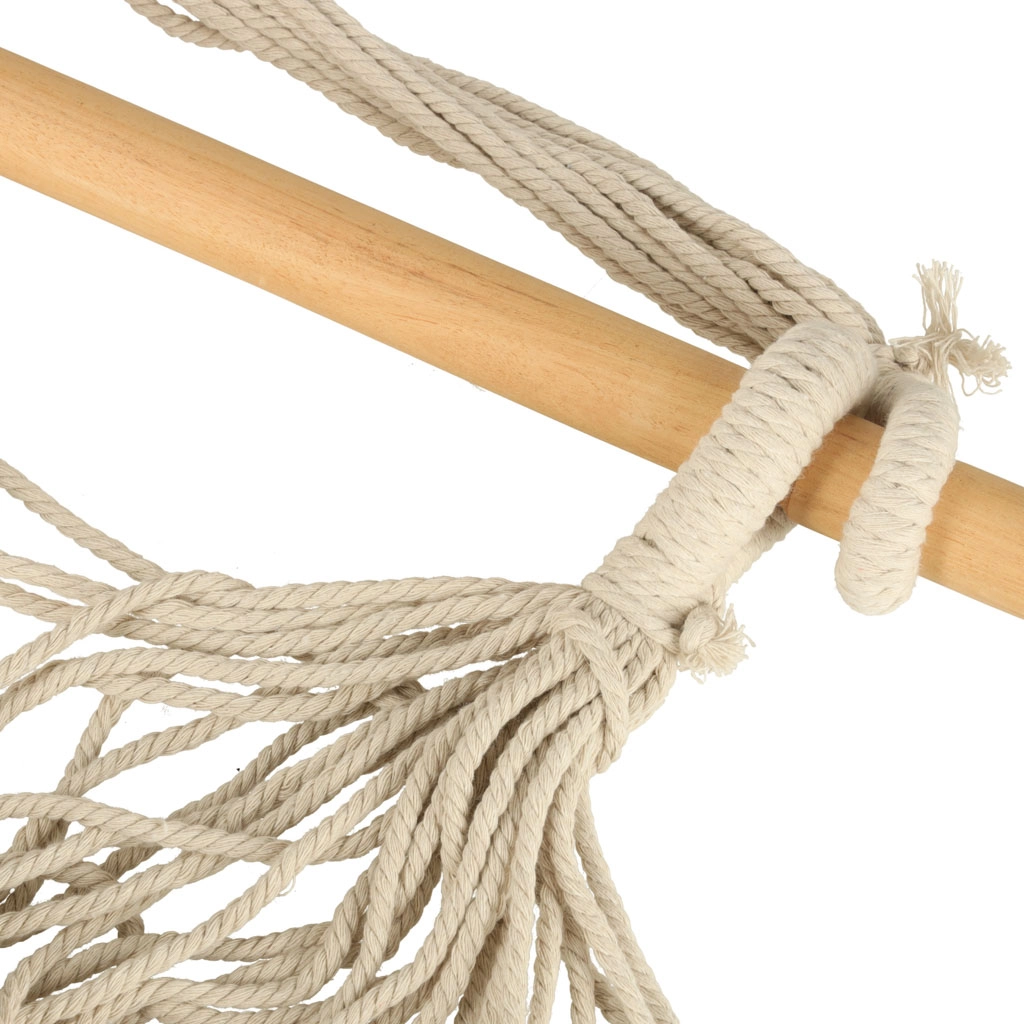 Acest mobilier suspendat se potrivește cu designul boho și poate fi așezat în grădină sau cabană. Materialul este plăcut la atingere și ajută la reducerea stresului. Pachetul include scaunul, o bară de lemn, frânghii suspendate și două perne confortabile. Adaugă un colț de liniște și confort în viața ta.
